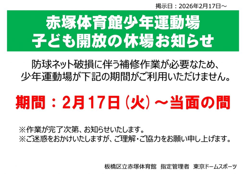 赤塚体育館少年運動場子ども開放の休場のお知らせ