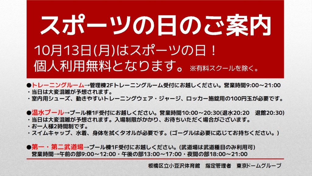10月13日(月祝)はスポーツの日です。個人利用料は無料となります。