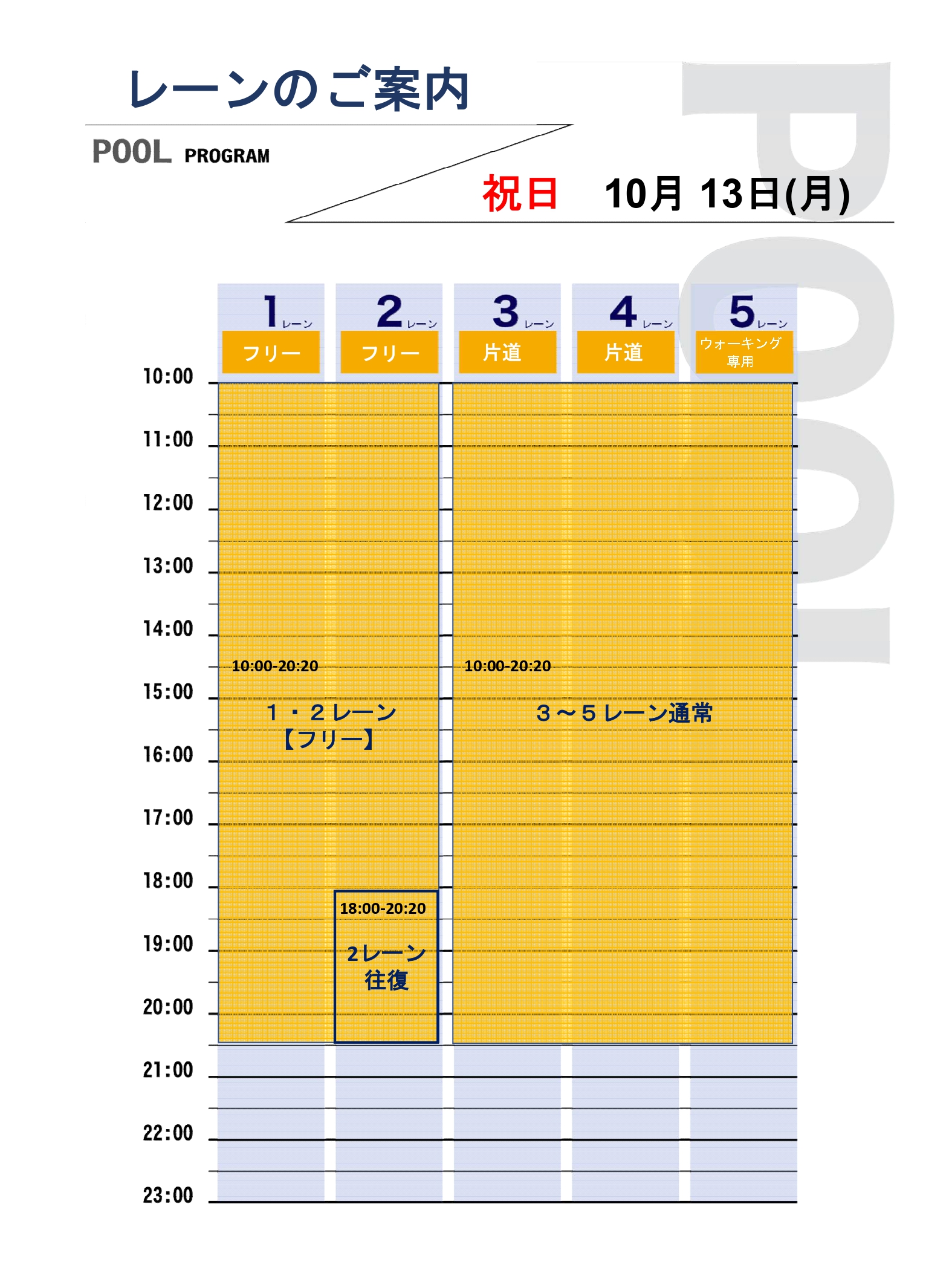 10月13日(月)9月23日祝日プールレーンのご案内です。