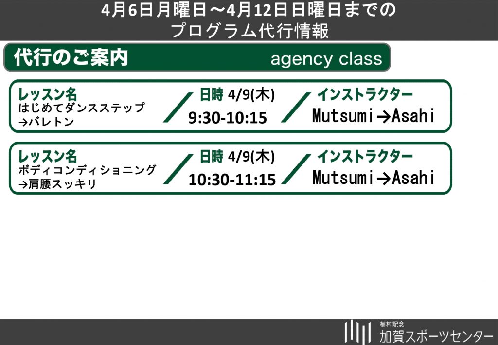 4月6日(月)~4月12日(日)プログラム代行休講のおしらせ