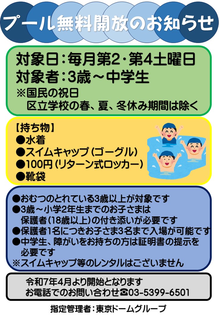 ●プール無料開放(小人・小人障がい対象)第2・第4土曜日(国民の祝日、区立学校の春・夏・冬休み期間は除く)詳細はこちら