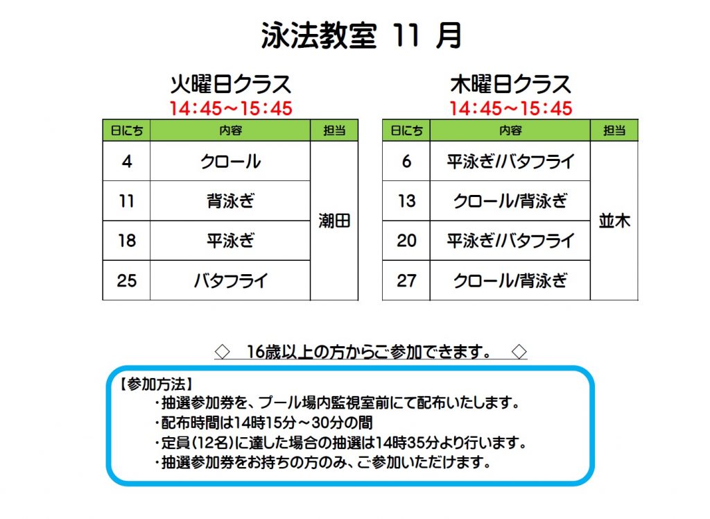 泳法教室 11月開催日程のお知らせ(2025.10.31更新)