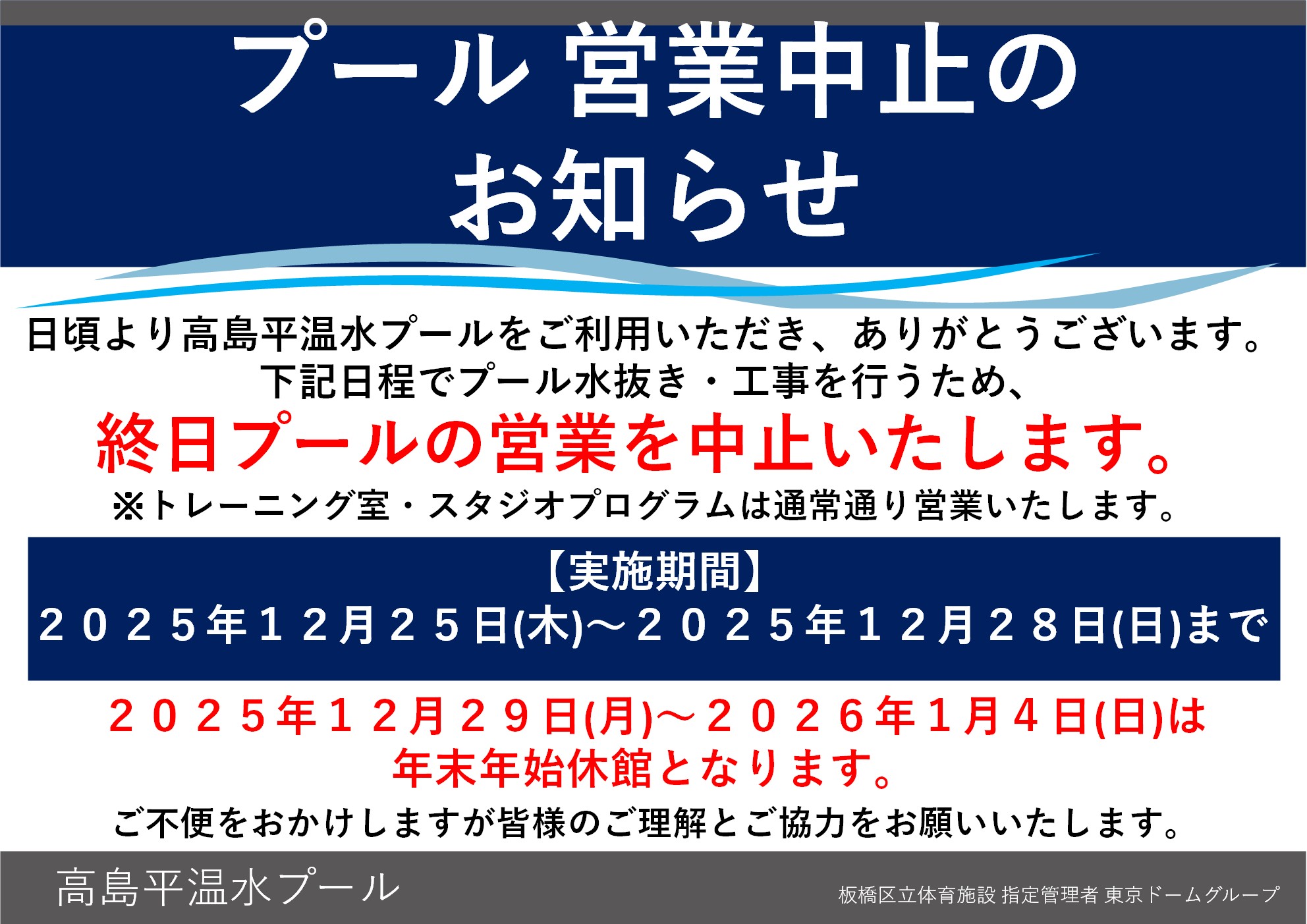 下記日程でプールの水抜き・工事を行うため終日プールの営業を中止いたします。