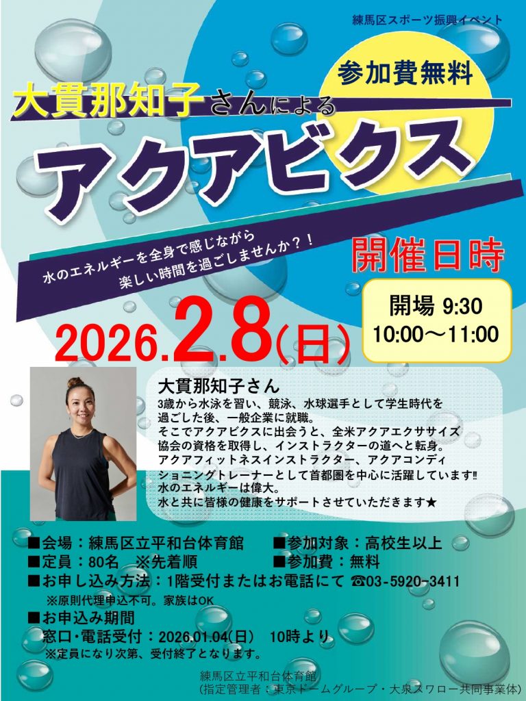 2月8日(日)に大貫那知子さんによるアクアビクスを開催します。