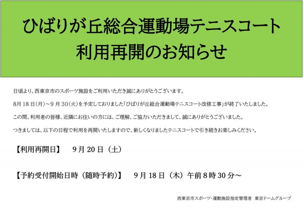 【ひばりアム テニスコート利用再開】のお知らせ(R7/9/16掲載)