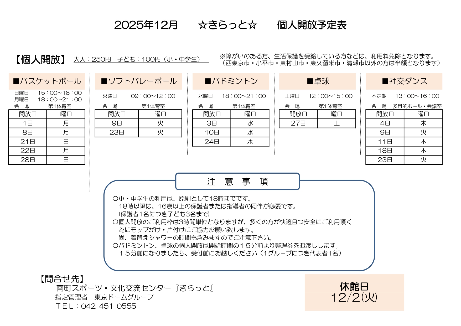 【2025年12月】個人開放 日程表(R7/11/15掲載)