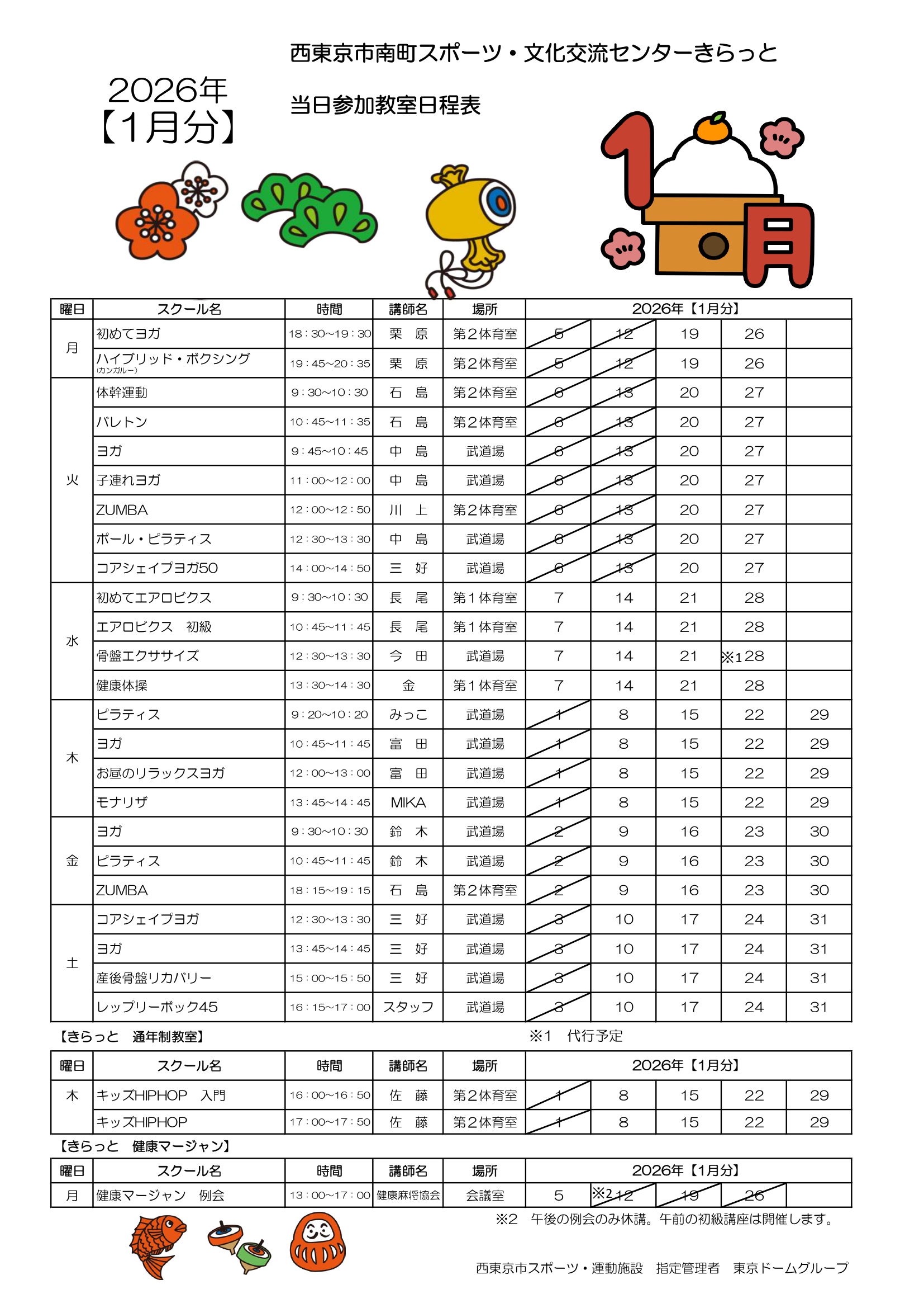 【2026年1月】当日参加教室 日程表(R7/12/15掲載)