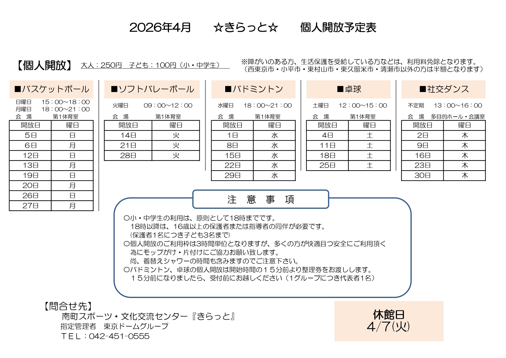 【2026年4月】個人開放 日程表(R8/3/15掲載)