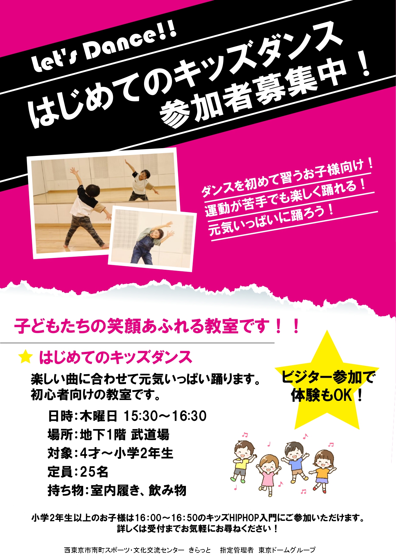 キッズHIPHOP入門 小学2年生~中学生 16:00~16:50 20名