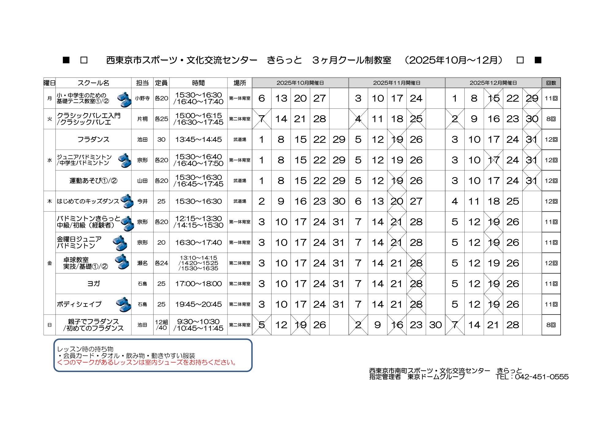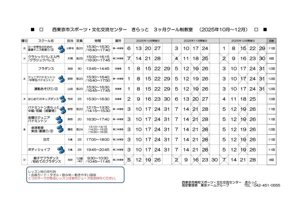 3ヵ月のクール制で行う教室です。バドミントンや卓球、ダンス等、大人向けから子供向けまで様々な教室がございます。