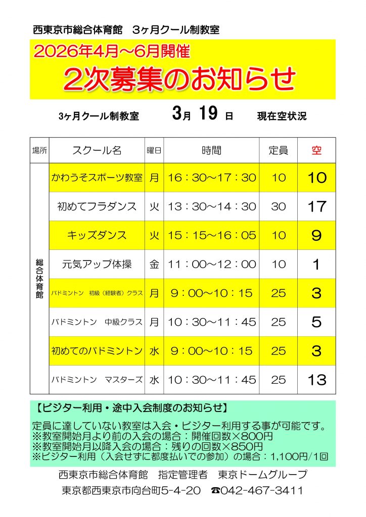 【4月からの3ヶ月クール制教室2次募集のお知らせ】