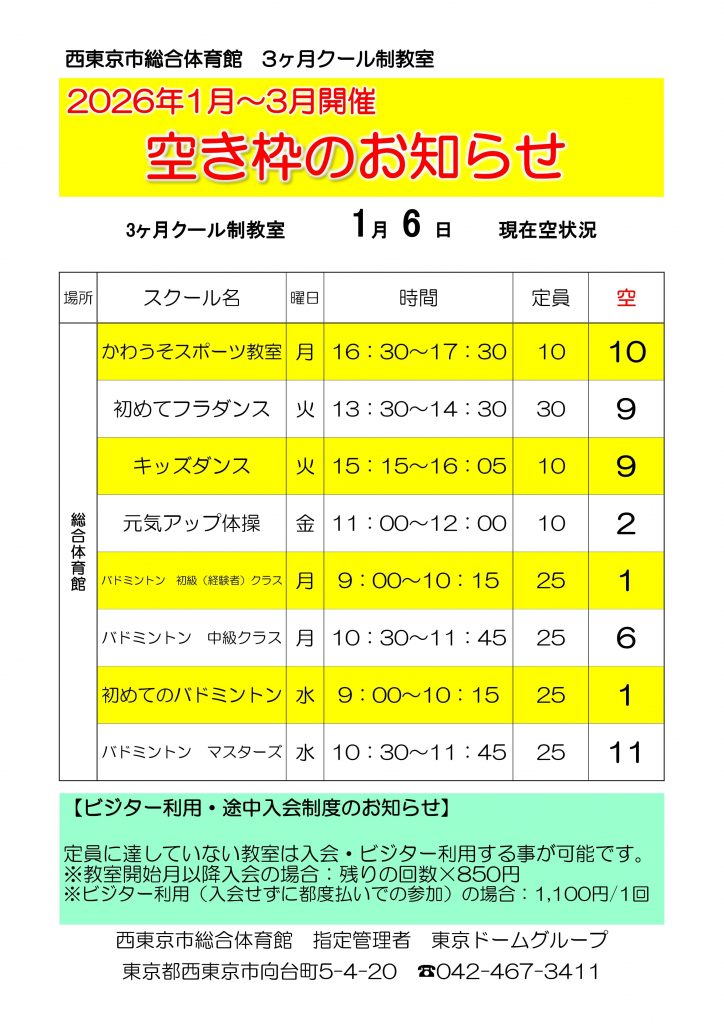1月~3月開催の3ヶ月クール制教室の空き枠に変更があったのでお知らせ致します。