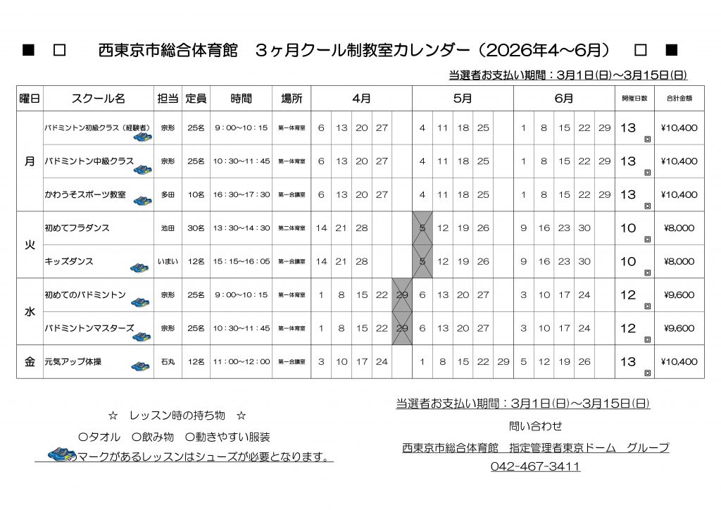 ※途中参加、ビジター利用をご希望の方は、事前に総合体育館に空き状況をご確認下さい。 なお、教室参加の方は駐車場のご利用はいただけませんので徒歩または自転車でご来館ください。