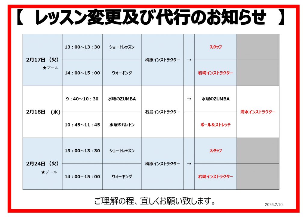 レッスン変更及び代行のお知らせ(R8.2.10掲載)