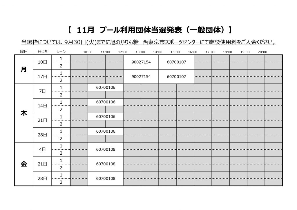プール一般団体利用の11月分抽選結果をお知らせいたします。