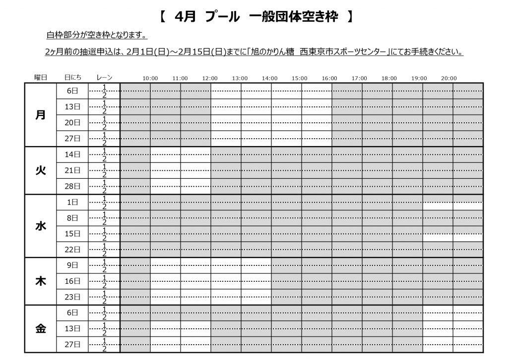 プール一般団体の4月分抽選申込可能枠をお知らせいたします。