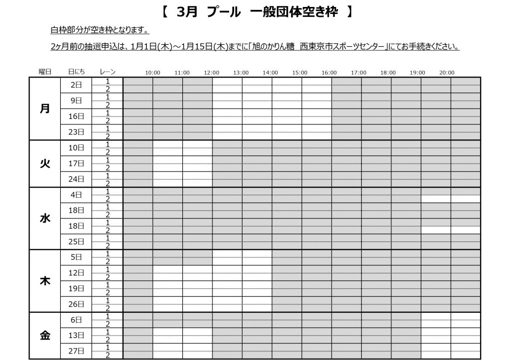 プール一般団体利用 3月分抽選申込可能枠(R8.1.1掲載)