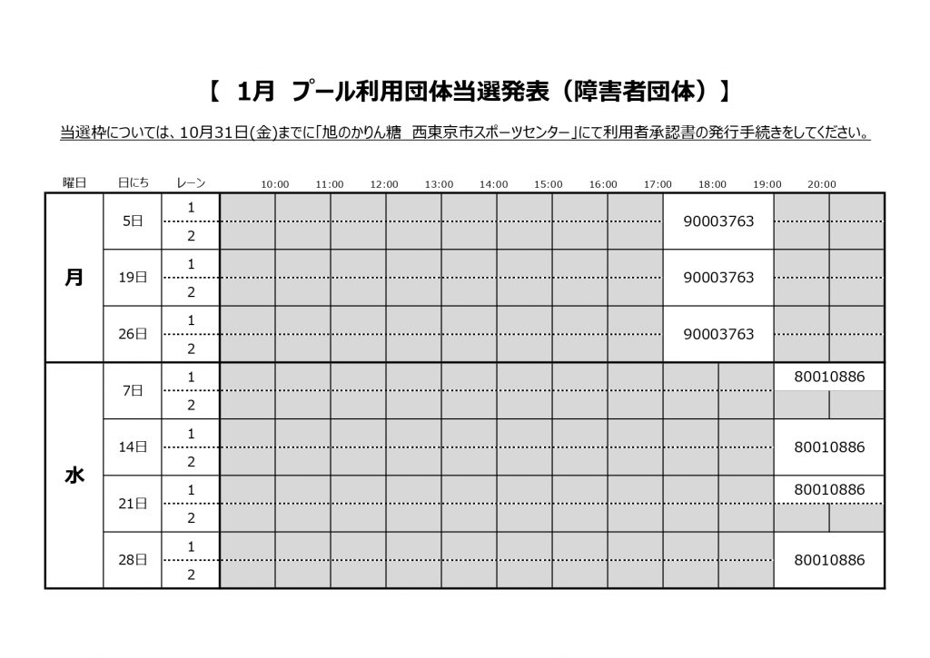 プール障害者団体の1月分抽選結果をお知らせいたします。