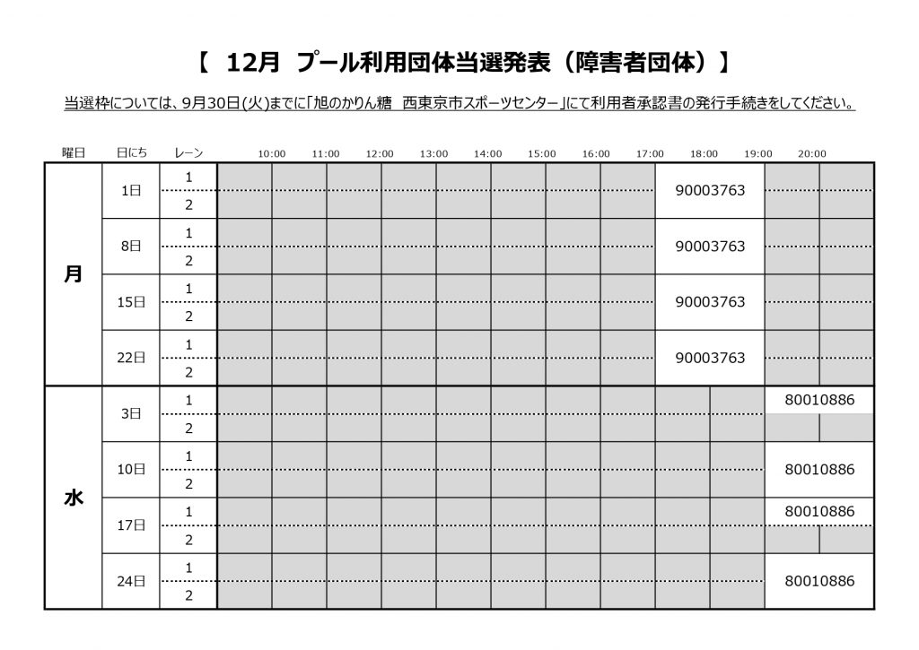 プール障害者団体の12月分抽選結果をお知らせいたします。