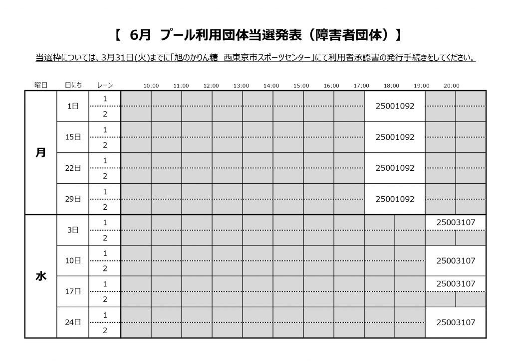プール障害者団体の6月分抽選結果をお知らせいたします。