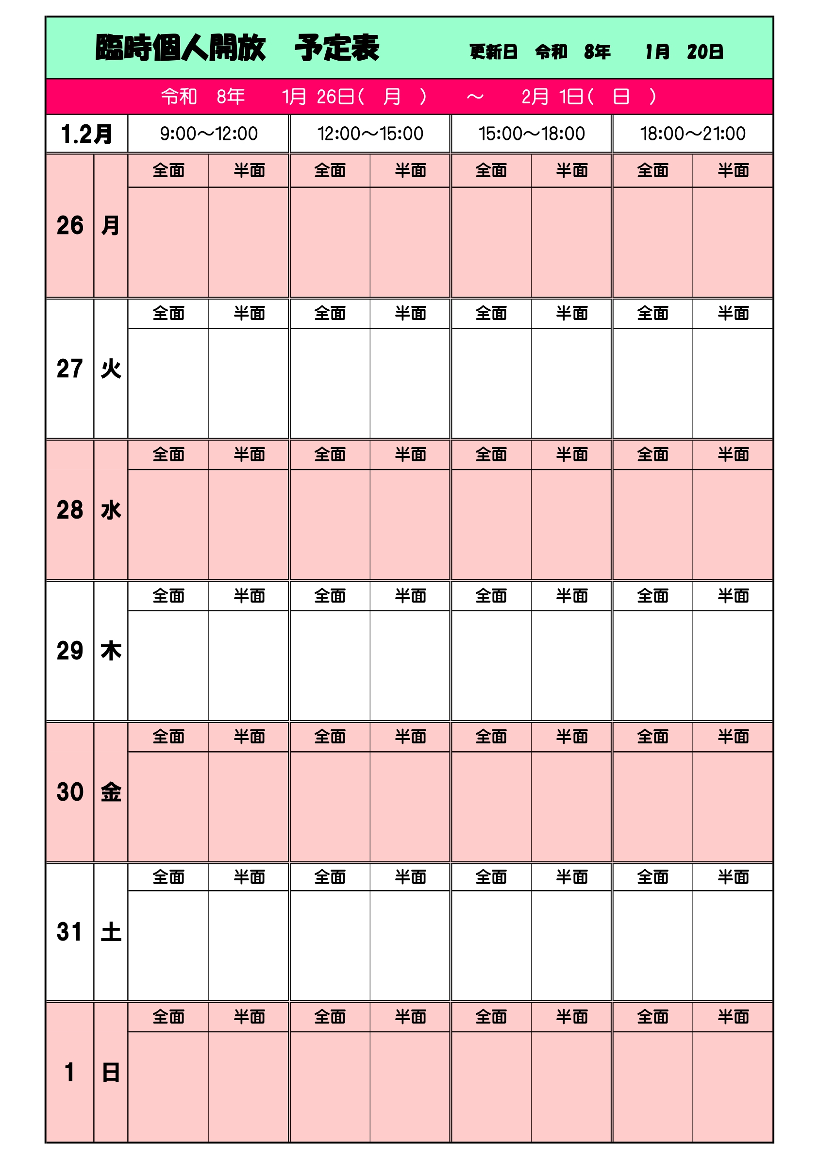 1月26日(月)~2月1日(日)の臨時個人開放は開放なしとなっております。