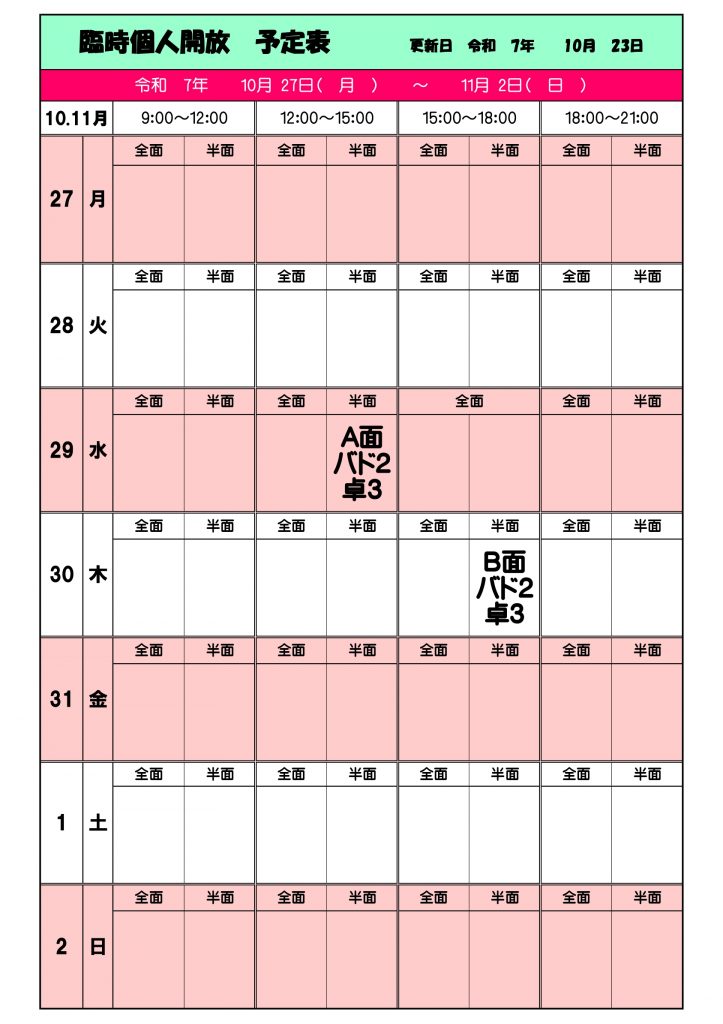 臨時個人開放 10月27日(月)~11月2日(日)の予定について