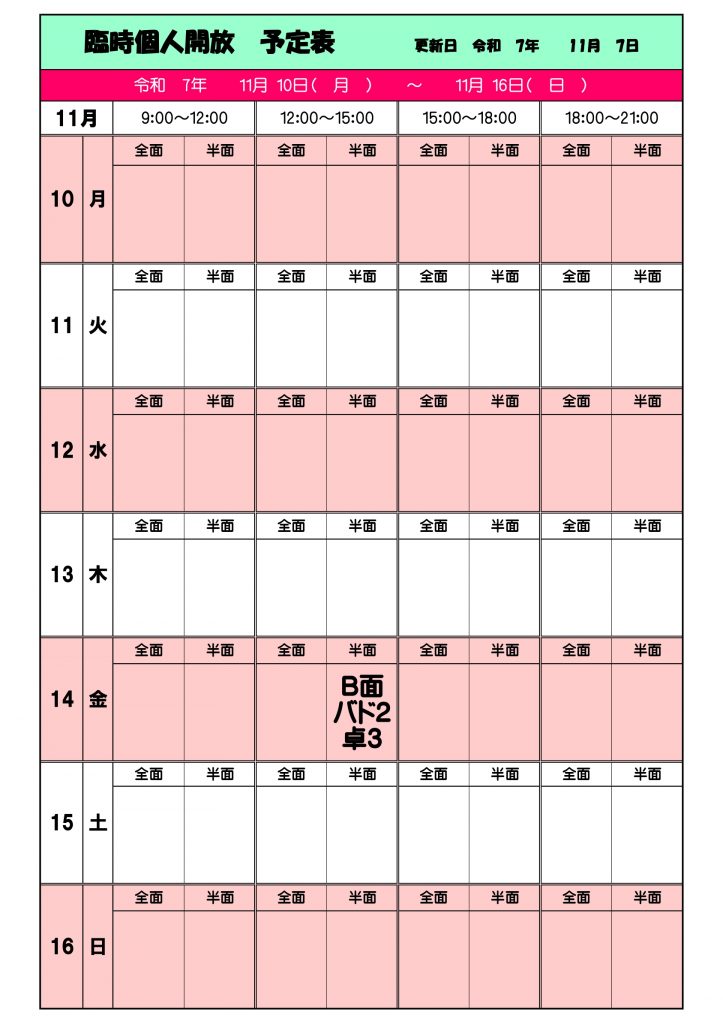 臨時個人開放 11月10日(月)~11月16日(日)の予定について