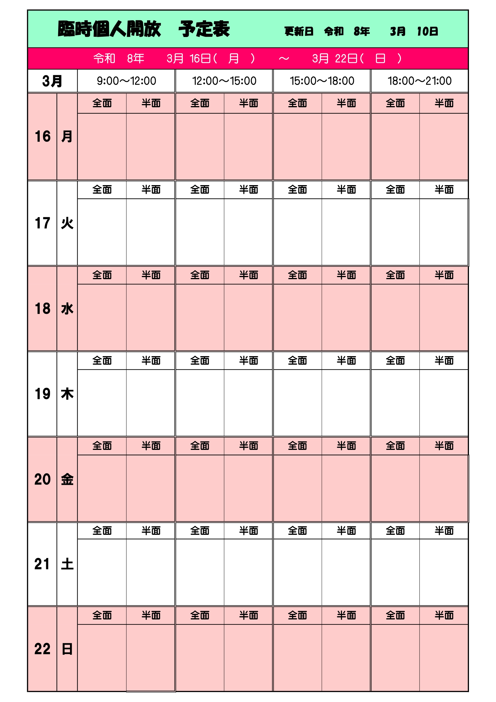 3月16日(月)~3月22日(日)の臨時個人開放は開放なしとなっております。