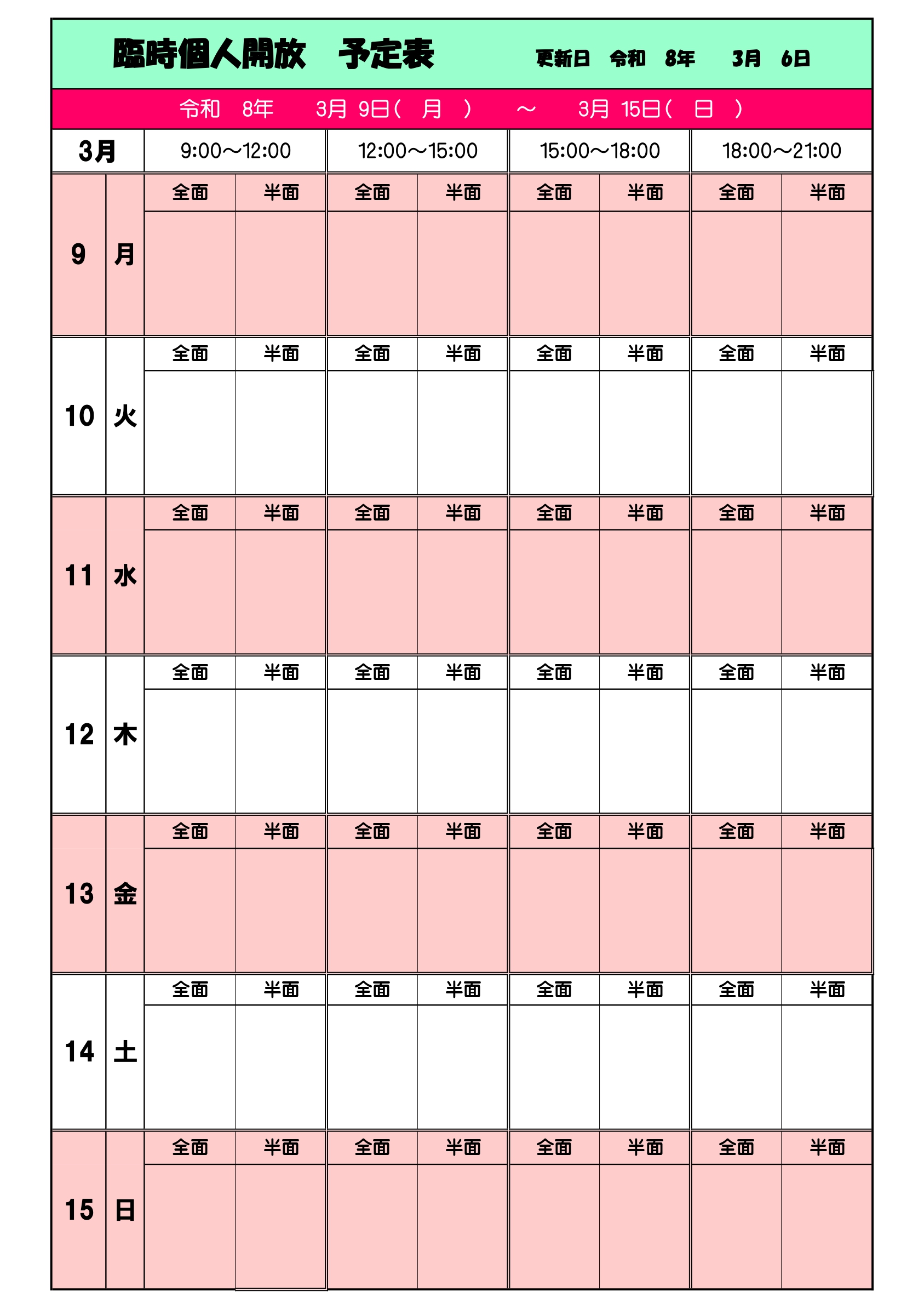 3月9日(月)~3月15日(日)の臨時個人開放は開放なしとなっております。