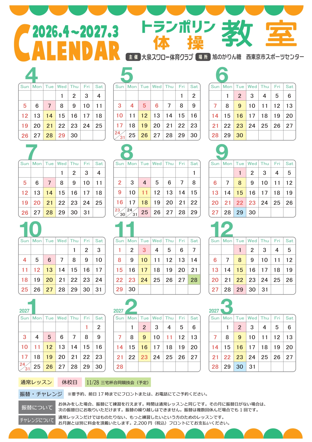 - 大泉スワロー体操クラブの専門指導員による、トランポリン&体操教室です。