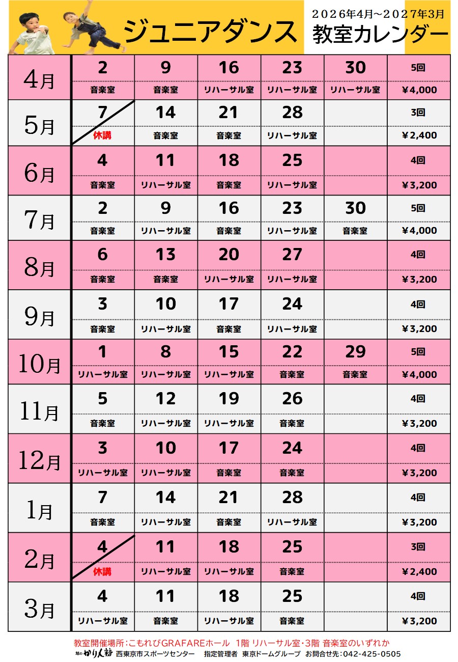 | 開催曜日 | クラス/開催時間 | 対象学年 | 参加費/1ヶ月 |