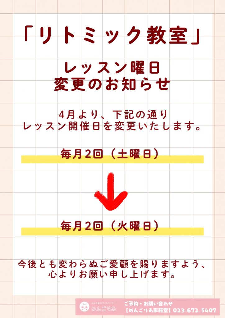 【リトミック教室 レッスン開催日変更のお知らせ】