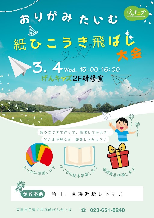 3月4日(水)のおりがみたいむは紙ひこうき飛ばし大会を開催いたします。
